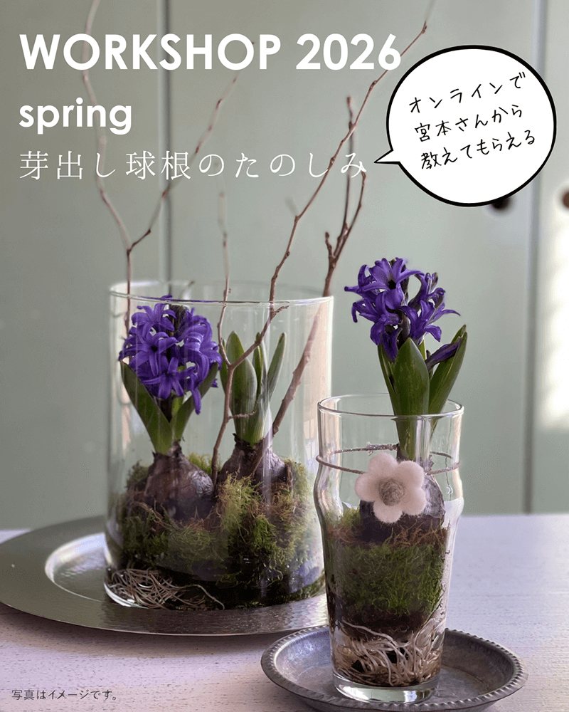 | 詳細 | ~WORKSHOP 2026 spring~ 芽出し球根の楽しみ 今年もたくさん、 庭からの素敵な贈り物を感じていただければ幸いです。 今回のレッスンはオンラインで宮本里美さんが直接教えてくださいます。 芽出し球根を寄せ植えしたり、水栽培したり。 レッスン後にはセムラと北欧紅茶でティータイムを。 宮本さんのお話もたくさん聞くことが出来ますよ! ぜひお気軽にご参加くださいませ。 【日時】2/15(日) 10:00~13:00 / 14:00~17:00 【定員】各回5名(要予約) 【費用】材料費5,500円(税込) 【持ち物】お持ち帰り用の袋 エプロンor汚れても良い服 【場所】株式会社千田建築 沼津市鳥谷88-2 【お申込み】HPイベントフォームより必要事項を入力のうえお申込みください。折り返しメールをさせていただきます。 ※ヒヤシンスの花色はアソートです。ご了承ください。 ※イベント内容や日程は事情により、変更になる場合もございます。 ※ご予約後のキャンセルは花材または完成品のお渡しとさせていただきます。 ご不明な点がございましたらお気軽にお問合せ下さい。 |
