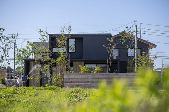 コンパクトな建物を敷地に対して角度をつけて配置することで、