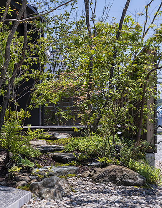 玄関からウッドデッキへのアプローチは雑木林を歩いているような気持ちになります。