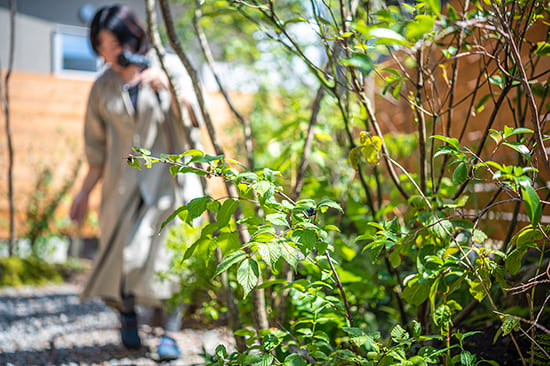 和モダンな建物の魅力を引き立てる雑木の庭。