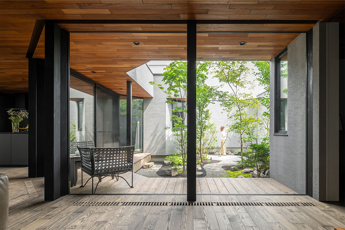 建物の中心に中庭を配置したことで、リビングのどこにいても自然と緑が目に入ります。L字型のウッドデッキはリビングとシームレスにつながり、室内にいながらアウトドアの開放感を感じられます。外からの視線を気にすることなく、自分らしい時間を楽しめる空間です。
