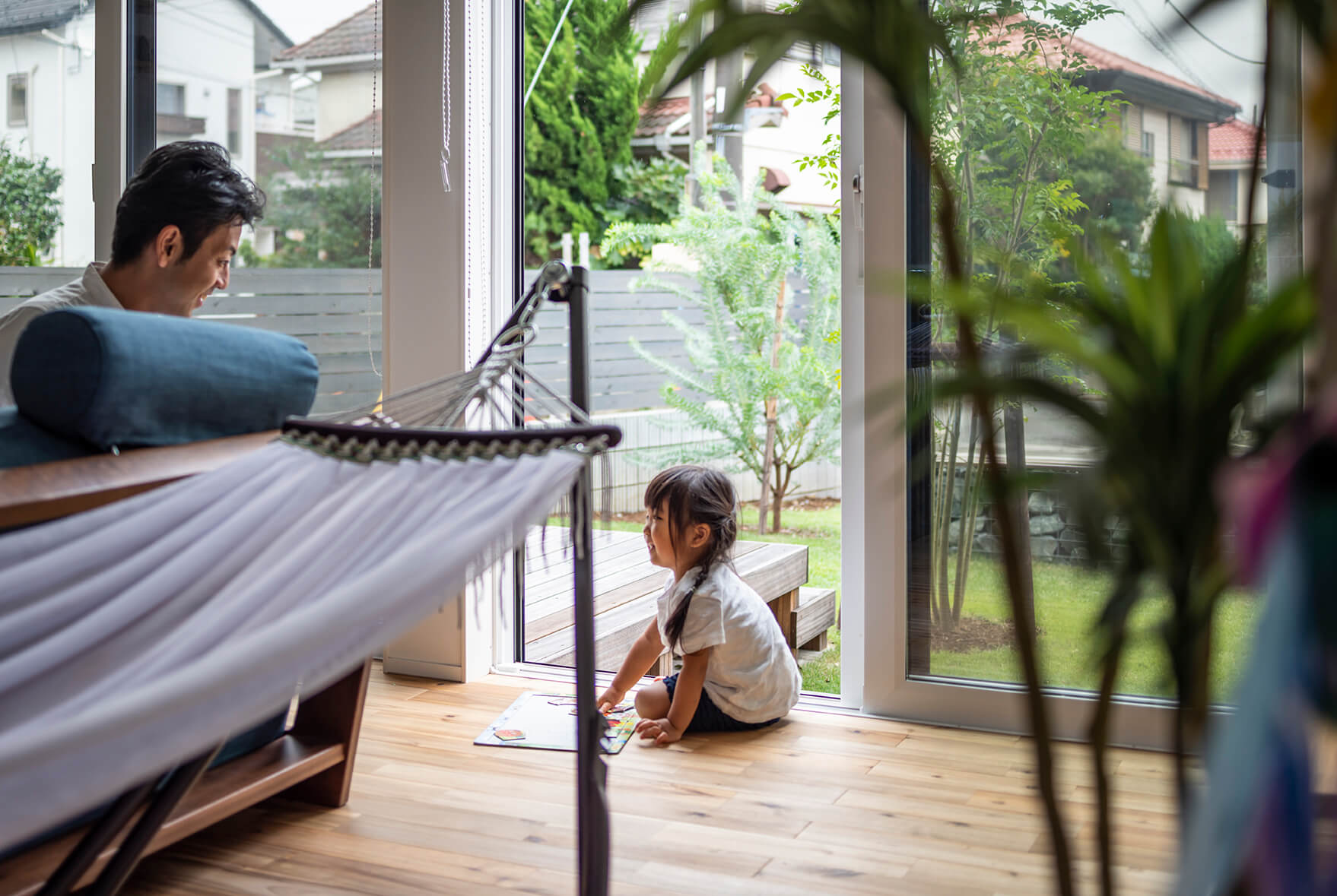 ウッドデッキに腰かけて子供が遊ぶのを見守ったり、