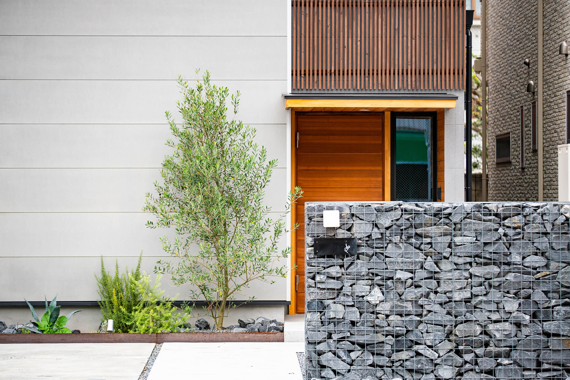 通りから玄関に直接丸見えにならないように、ガビオンで門扉を配置。また、ガビオンの塀を高くすることで、自転車置き場の目隠しとしての役割も。