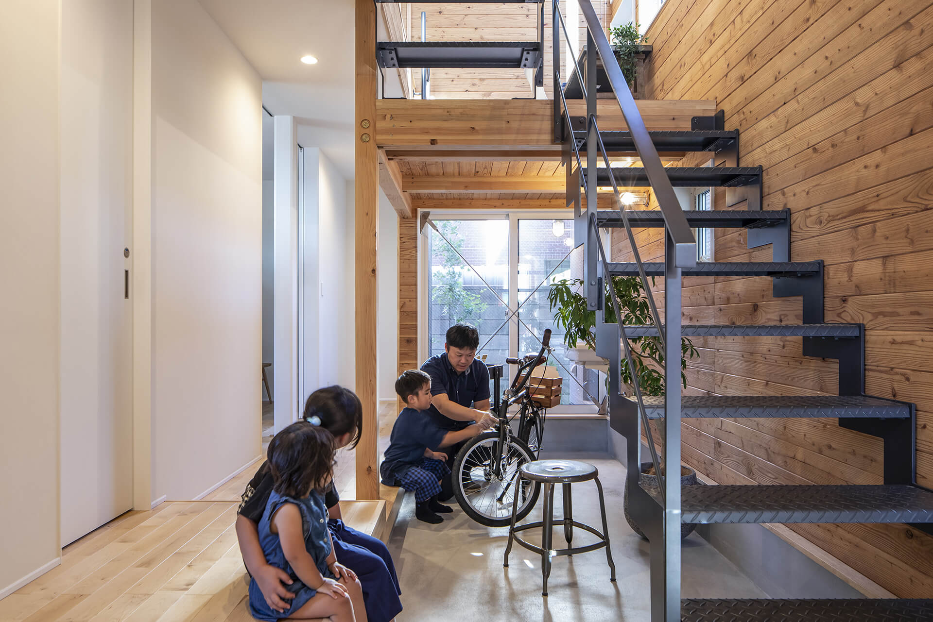 玄関から続く内部土間からも、緑が見えるように植物を配置。