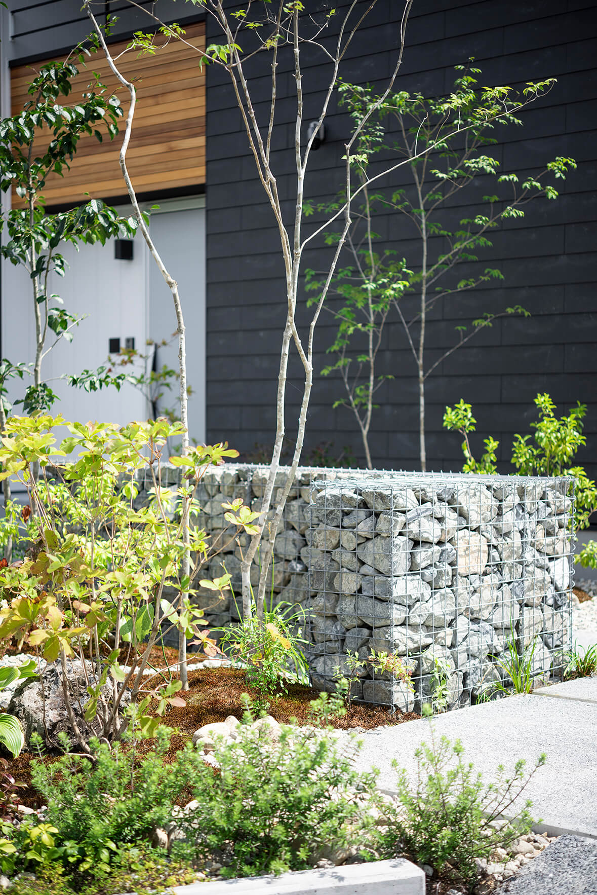 ガビオン石積みは 圧迫感なく外と内を区切ることができ、