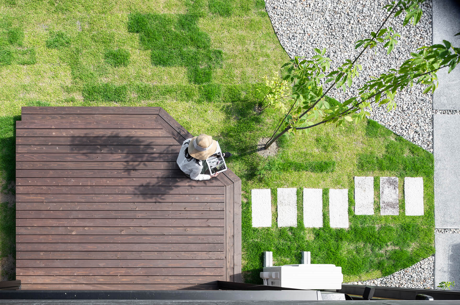リビングとプライベートガーデンをつなぐウッドデッキは広く、